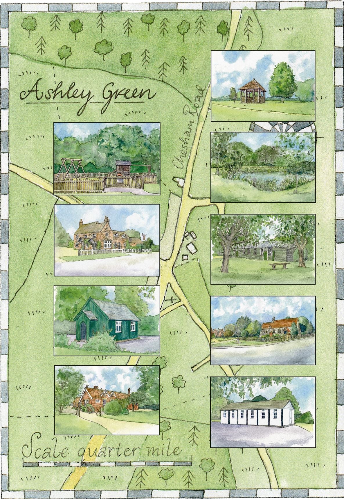 Ashley Green, Bucks, a multi- view image taken from my rather older range of pen & ink/watercolour pictures ( this one is not fron =m a gouache painting)