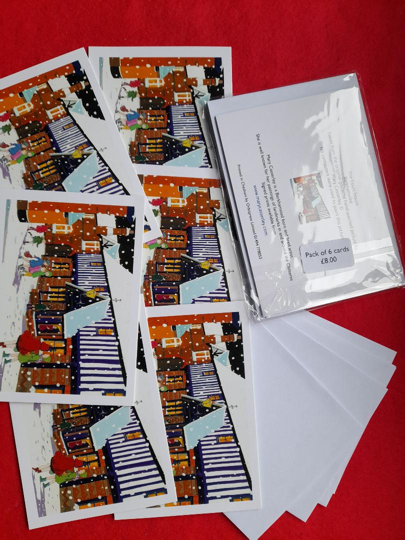 Mini pack of six A6 cards of Berkhamsted The Court House in the snow. The children are off to a party. Cards are blank inside for your own message. white envelopes. Each card 10cm x 15.5cm approx