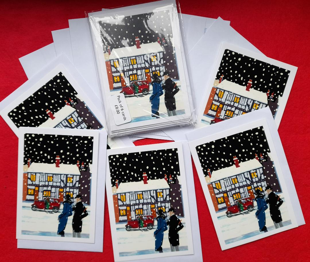 Mini pack of six A6 cards of Dean Incent's House, Berkhamsted in the snow. My painting is set in 1933 with a red Morris car. The couple are waiting for their friend before heading into St Peter's Church The Cards are blank for your own message. White envelopes. Each card 10.5cm x 15cm approx