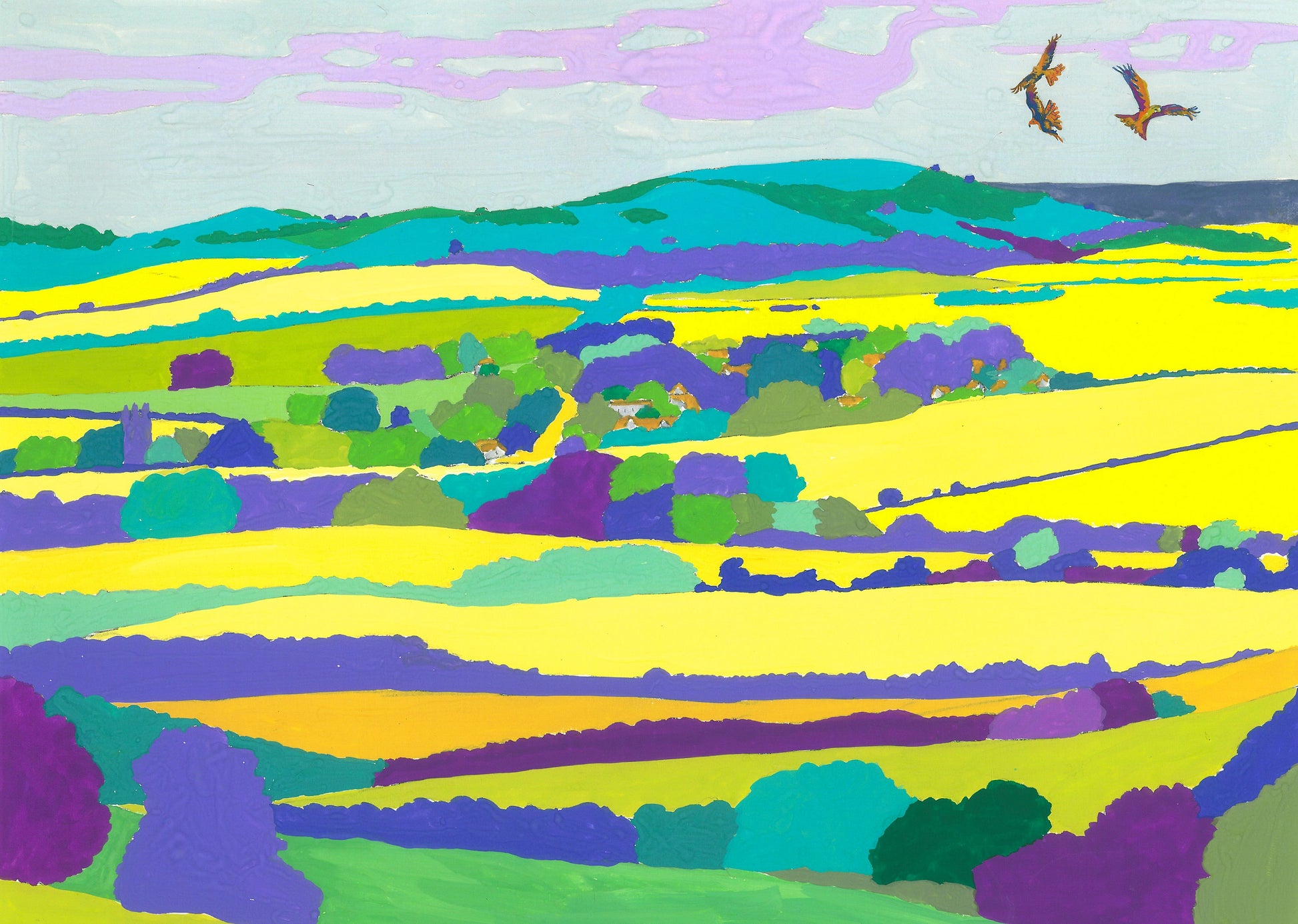 A view from Dunstable Downs, Bedfordshire showing Red Kites circling. In the distance is Ivinghoe Beacon