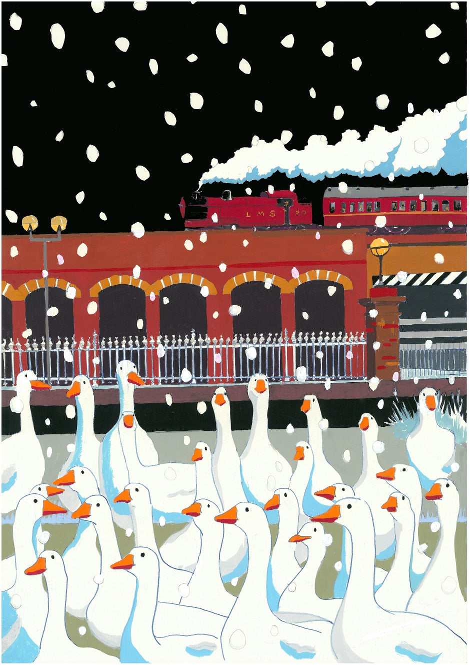 This picture was inspired my my daily commute (on bicycle) along the canal. These Canada Geese were the bain of the towpath users. Berkhamsted Station in the background still has the original tall arches from the 1830's with an LMS loco steaming through