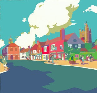 Old Amersham High St and Church, showing the Market House. This is a square image, available as a 8" x 8" or 12" x 12" print. Or as a card. ( 6" x 6")
