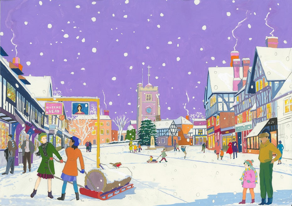 Pinner, Middlesex in Winter shows the High St in the snow outside The Queen`s Head Pinner is a mid-sixteenth century building. The beam is a reminder of its stage-coaching days. From here the 13 mile journey to London was started with the landlord of the Inn driving the horse-drawn coach. My late father-in-law was the Rev'd Ian Murray at St John the Baptist church shown at the top of the High St