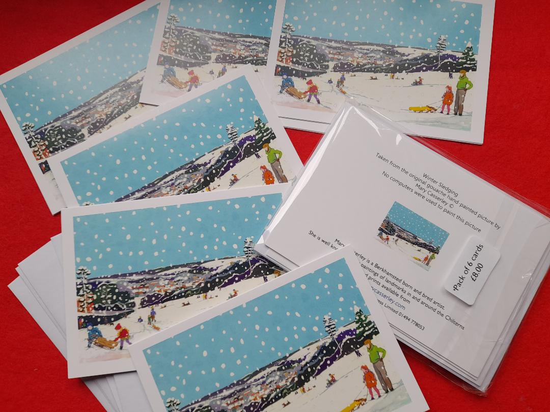 Mini pack of six A6 cards of Sledging in Berkhamsted. Tompkins Meadow has always been the sledging spot growing up in Berkhamsted for our family. Cards are blank for your own message. Each card 10.5cm x 15cm approx. white envelopes