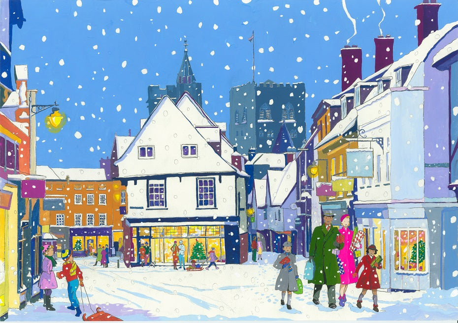 The view from St Albans market area looking towards the Abbey in the mid-winter snow.
