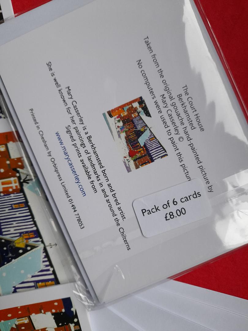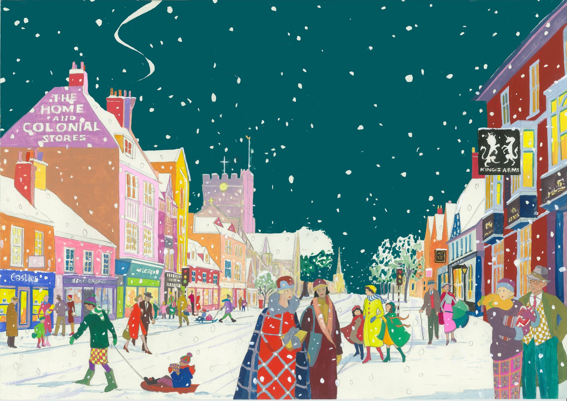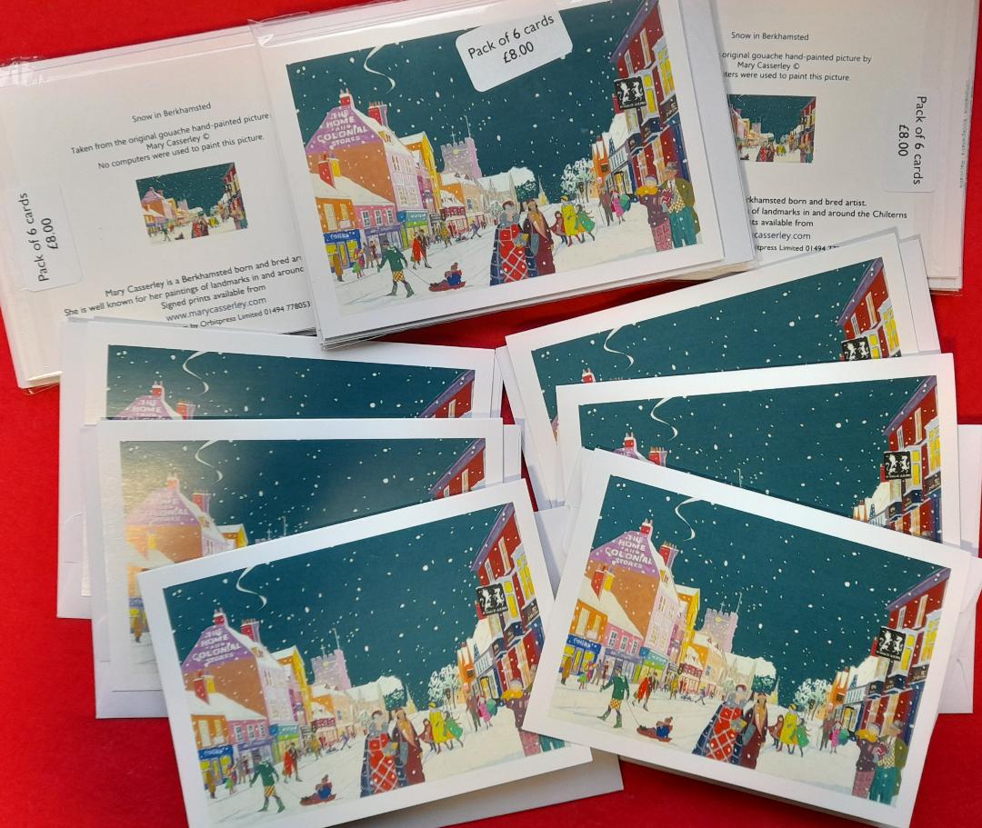 Mini pack of six small A6 cards of Berkhamsted High St in the snow showing the iconic Home & Colonial wall to the Left and The Kings Arms to the Right.