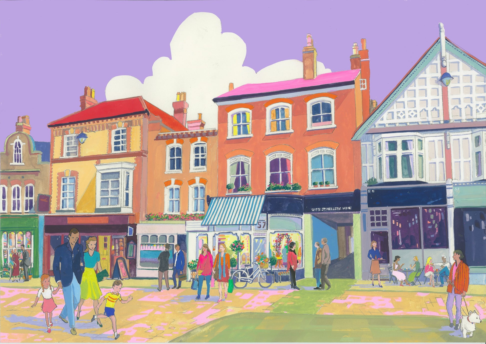 This eclectic section of High Street shops in Old Town Hemel Hempstead has a varied roofline. The vibrant, independent gift shop 'House of Elliott' is centre stage.