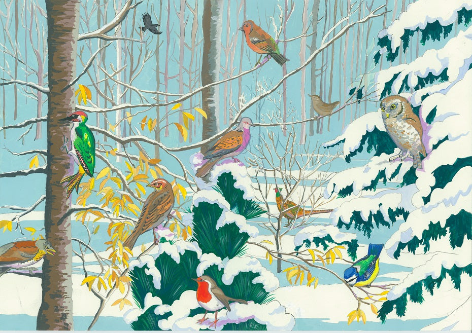 A winter British Birds smorgasboard! Inspired by my daily dog walks in and around Ashridge, Stubbins Wood Tring, and The Hockeridges, Berkhamsted I spent last winter working on this painting. sadly it only snowed one day last winter! Here I have captured: Chaffinch, Rook, Green Woodpecker, Turtle Dove, Tengmaln's Owl, Pheasant, Little Bunting, Blue-Tit, Robin, Field -Fare and Wren.